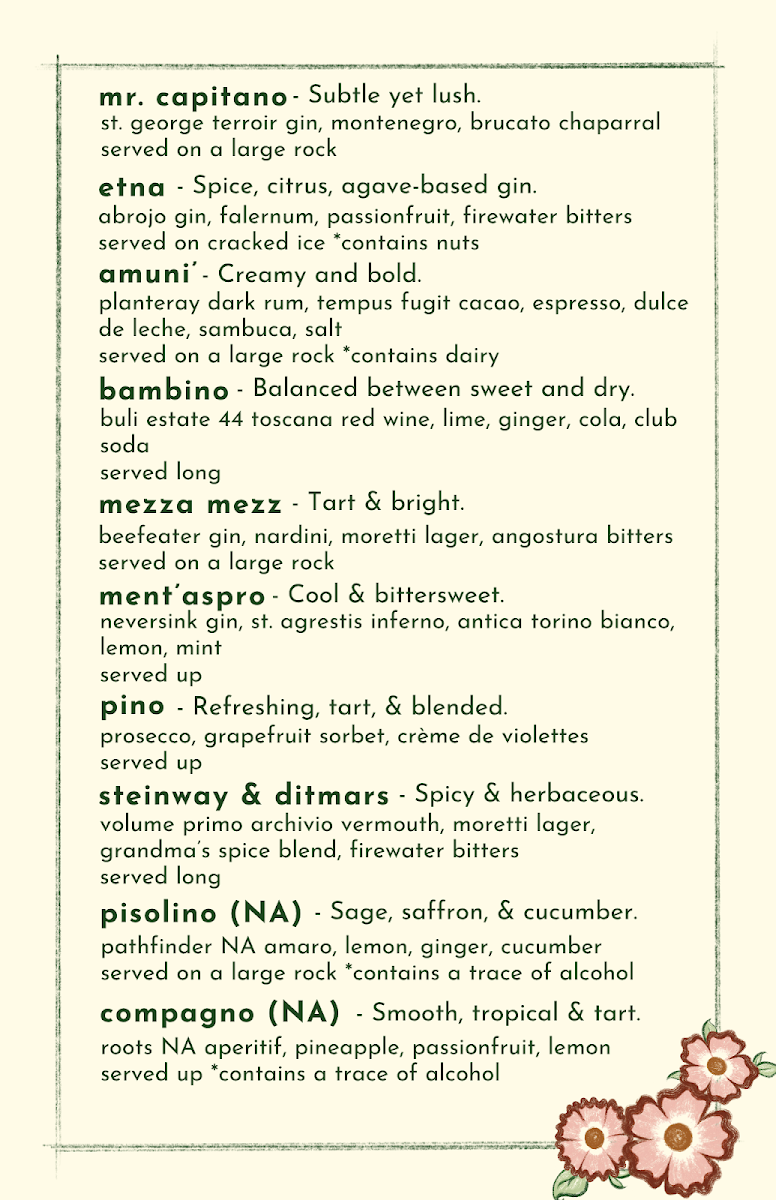 What sets Bar Enzo apart is its fantastic cocktail selection, with signature drinks such as the Sprezzatura and Porto Del Mar. My personal favorite was the orange-cello, handcrafted by the amazing bartender Carter. It's a captivating blend that has earned rave reviews by enchanted patrons.